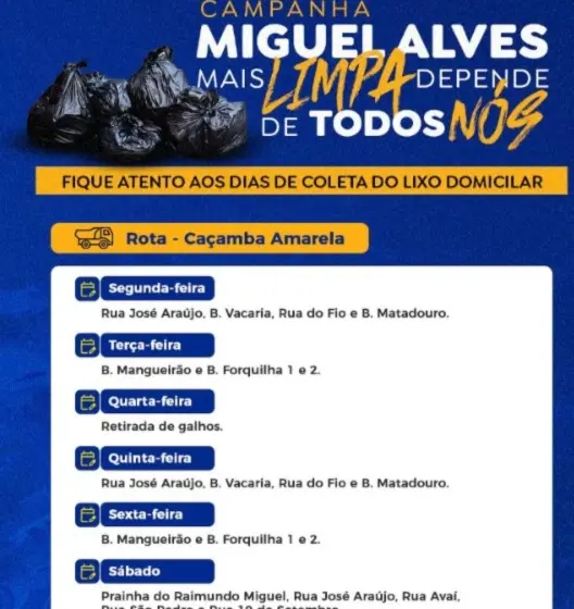 De acordo com a secretaria, o cronograma detalha os dias e as rotas específicas em cada bairroA Prefeitura de Miguel Alves, através da Secretaria de Meio Ambiente, divulgou o novo cronograma de coleta de lixo domiciliar, reforçando o compromisso com a limpeza urbana e a organização da cidade. A ação visa otimizar o serviço e garantir um ambiente mais limpo e saudável para todos os moradores.