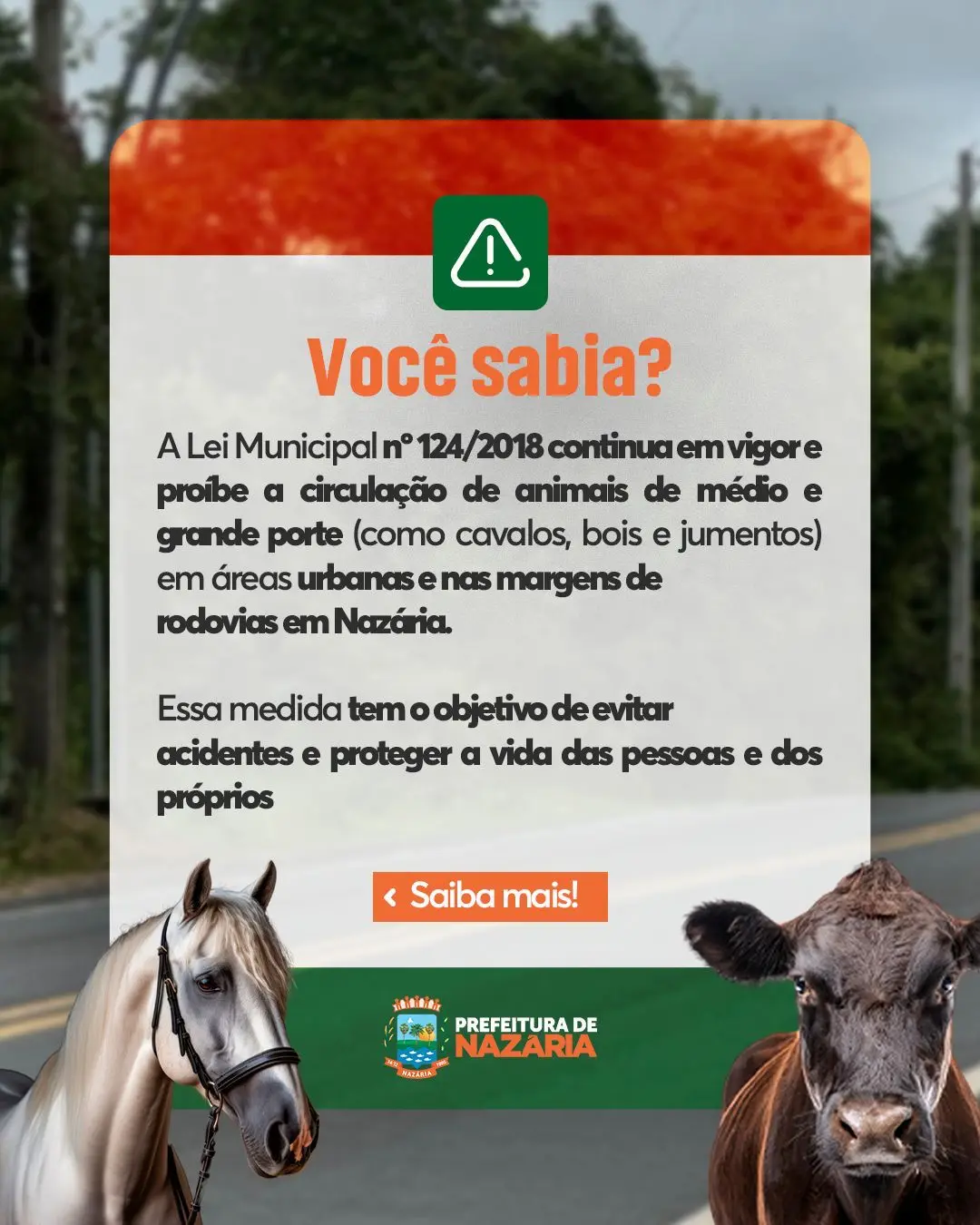 A ação tem como base a Lei Municipal nº 124/2018, que proíbe a presença de animais na área urbanaA Prefeitura de Nazária está intensificando a campanha de conscientização da população sobre os riscos e penalidades envolvendo a circulação de animais de médio e grande porte em vias públicas do município. A ação tem como base a Lei Municipal nº 124/2018, que proíbe a presença de animais como cavalos, bois e jumentos em áreas urbanas e nas margens de rodovias.