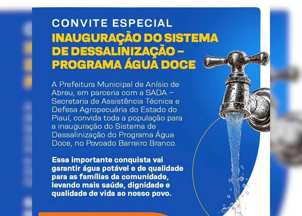 Solenidade de inauguração está marcada para este sábado (18), no povoado BarreiroAs famílias do Povoado Barreiro Branco, em Anísio de Abreu, no Piauí, têm motivos para celebrar. A Prefeitura Municipal, em parceria com a Secretaria de Assistência Técnica e Defesa Agropecuária do Estado do Piauí (SADA ), irá inaugurar o novo Sistema de Dessalinização do Programa Água Doce.