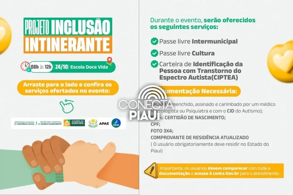 Ação garante direitos e oferece serviços voltados às pessoas com deficiência no municípioO Projeto Inclusão Itinerante está sendo realizado em Colônia do Gurgueia com o objetivo de fortalecer a cidadania e garantir direitos às pessoas com deficiência. A ação reúne diversos serviços voltados à inclusão e ao acolhimento social.