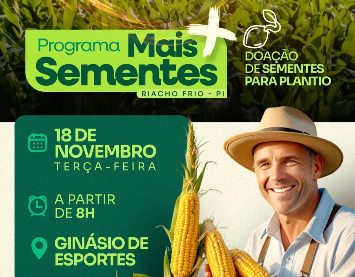 Programa tem como objetivo estimular o plantio e apoiar o homem e a mulher do campoA Prefeitura de Riacho Frio realiza, na próxima terça-feira, 18 de novembro, a distribuição de sementes por meio do Programa Mais Sementes, iniciativa voltada ao incentivo da produção rural e ao fortalecimento da agricultura familiar no município. O evento acontecerá a partir das 8h da manhã, no Ginásio de Esportes.