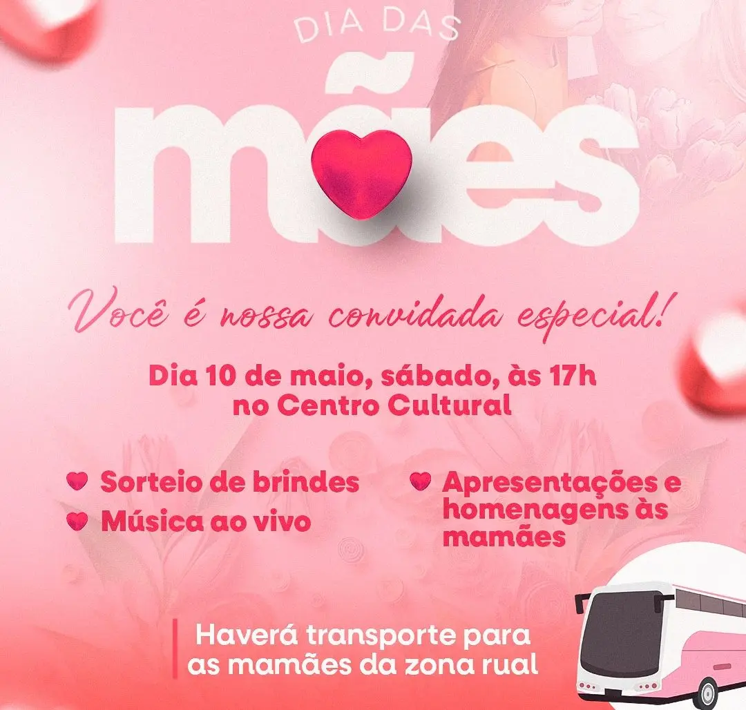 De acordo com a organização, a programação contará com apresentações culturais, homenagens às mães da cidade, música ao vivo e sorteio de brindes. A ação tem como objetivo promover um momento de lazer, reconhecimento e valorização das mães do município.