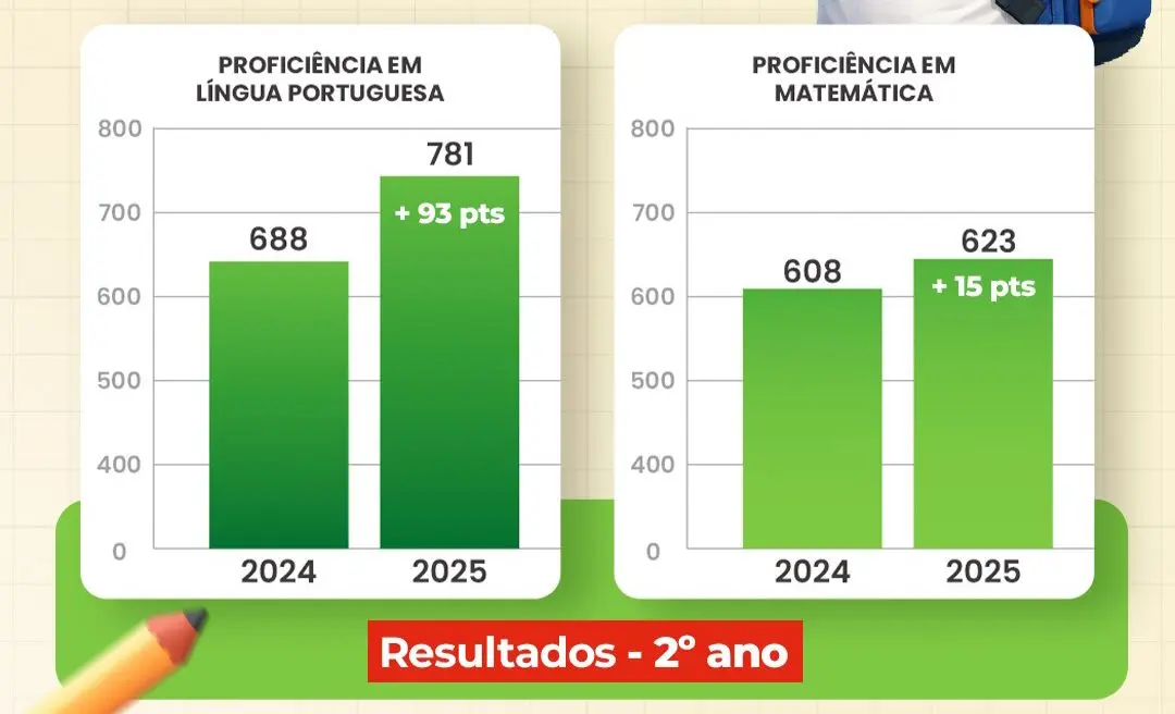 De acordo com os dados divulgados, houve crescimento expressivo na proficiência dos alunos do 2º ano do Ensino Fundamental. Em Língua Portuguesa, o município registrou aumento de 93 pontos em relação a 2024, alcançando 781 pontos. Já em Matemática, o avanço foi de 15 pontos, totalizando 623 pontos.