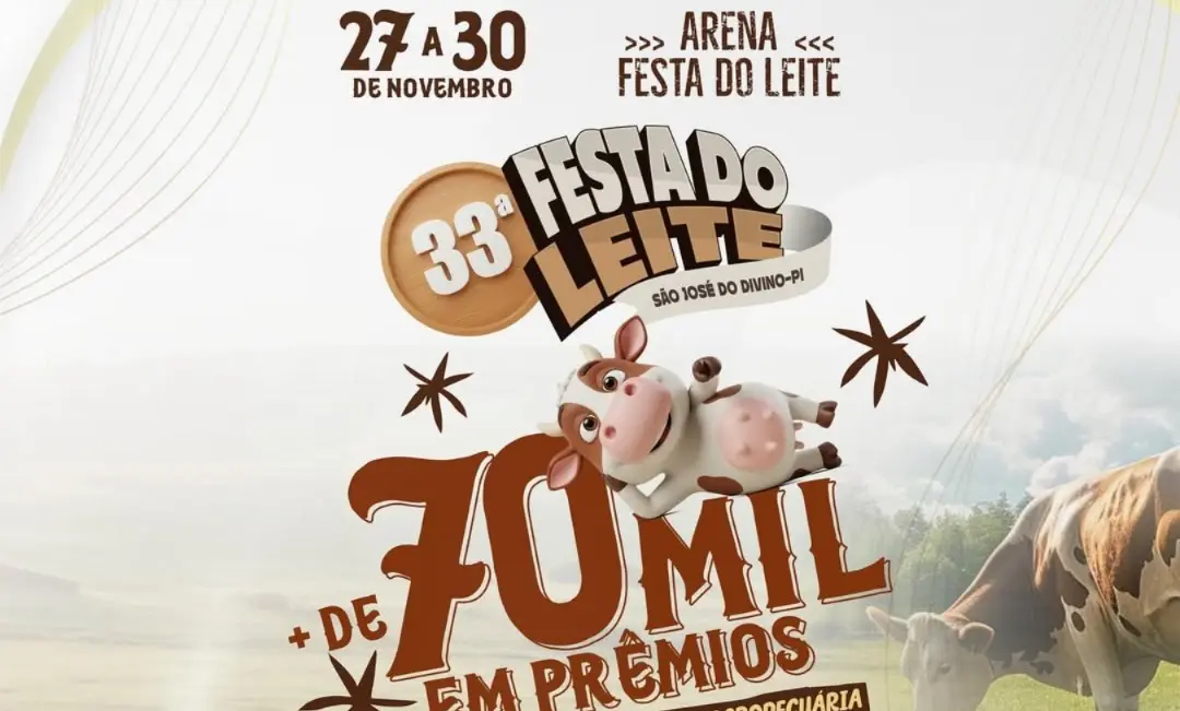 Evento será realizado de 27 a 30 de novembro na Arena Festa do LeiteA cidade de São José do Divino se prepara para celebrar a 33ª edição da tradicional Festa do Leite, que será realizada entre os dias 27 e 30 de novembro, na Arena Festa do Leite. O evento, já consolidado como um dos maiores do calendário agropecuário do estado, valoriza a tradição, a cultura e a força do campo piauiense.