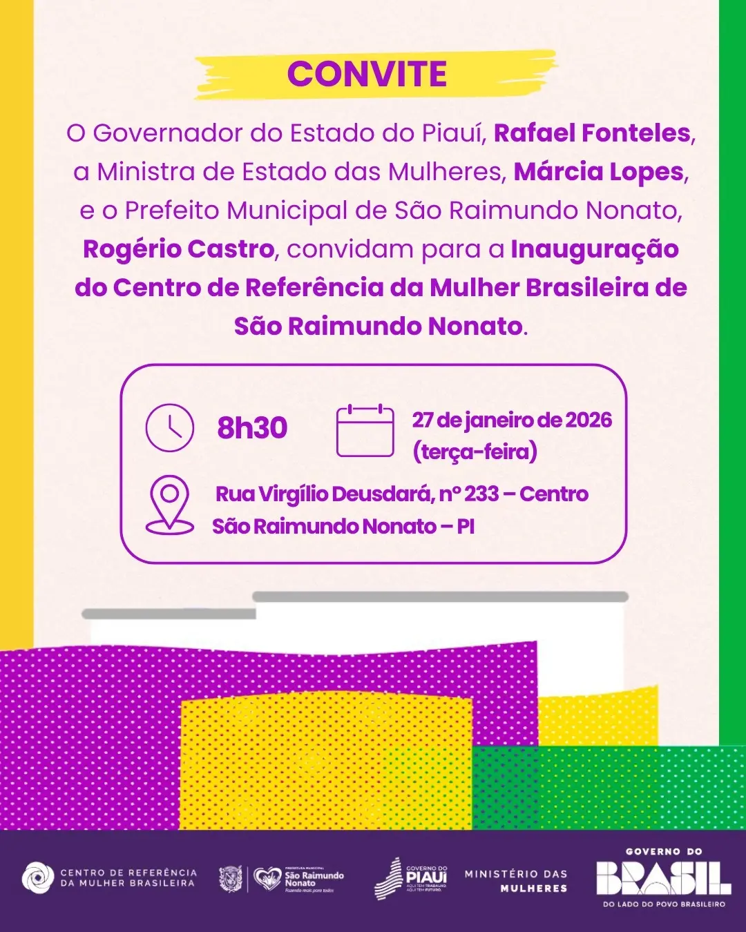 A solenidade contará com a presença do prefeito de São Raimundo Nonato, Rogério Castro, do governador do Piauí, Rafael Fonteles, e da ministra de Estado das Mulheres, Márcia Lopes, reforçando a importância do equipamento para o município e para o fortalecimento das políticas públicas em nível regional e nacional.