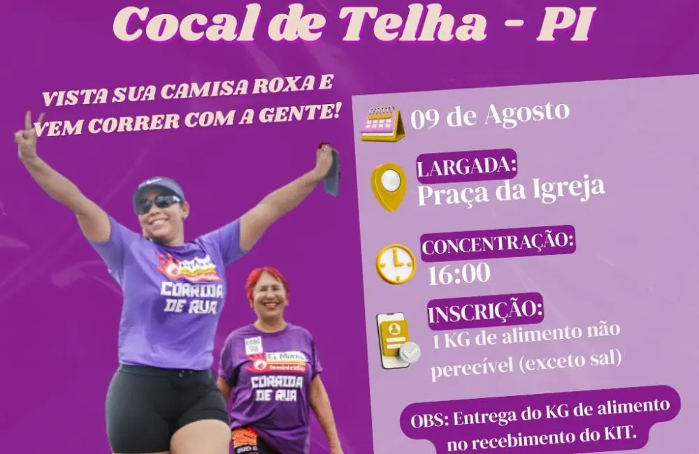 A iniciativa integra as ações do Agosto Lilás, campanha nacional de enfrentamento à violênciaO município de Cocal de Telha vai promover, no dia 9 de agosto, a Corrida de Rua Contra o Feminicídio, com apoio da Secretaria das Mulheres do Piauí (Sempi). A iniciativa integra as ações do Agosto Lilás, campanha nacional de enfrentamento à violência contra a mulher, e visa chamar atenção para a urgência do combate ao feminicídio.