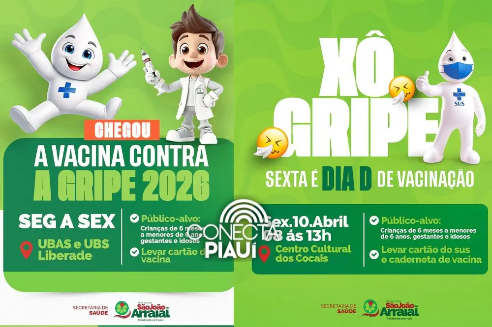 A Secretaria de Saúde de São João do Arraial promove, nesta sexta-feira (10), o Dia D de vacinação contra a gripe. A ação será realizada no Centro Cultural do município, das 8h às 13h.