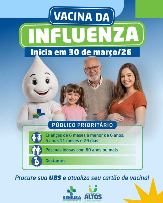 Campanha é voltada para grupos prioritários e será realizada nas UBS do municípioA campanha de vacinação contra a influenza terá início no dia 30 de março no município de Altos. A ação é promovida pela Secretaria Municipal de Saúde e tem como objetivo proteger a população contra o vírus da gripe, especialmente os grupos mais vulneráveis.