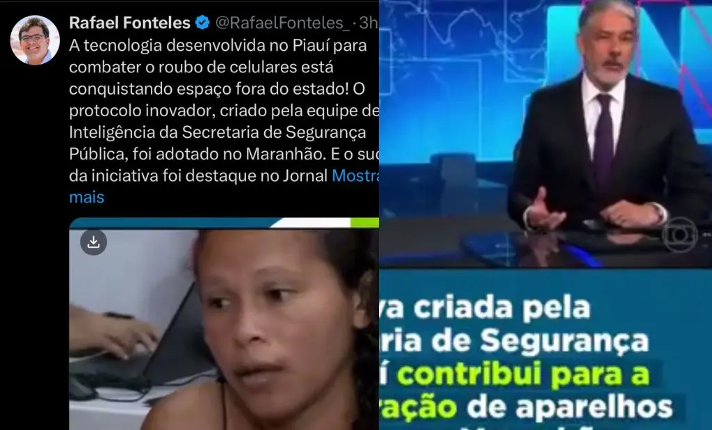 O vídeo da reportagem foi publicado pelo governador do Piauí, Rafael Fonteles em suas redes sociaisMais uma vez a inovadora iniciativa de segurança pública do Piauí, criada para combater o roubo de celulares, ganhou destaque nacional ao ser mencionada no Jornal Nacional da Globo. O vídeo da reportagem foi publicado pelo governador do Piauí, Rafael Fonteles em suas redes sociais, nesta quinta-feira (24/10).