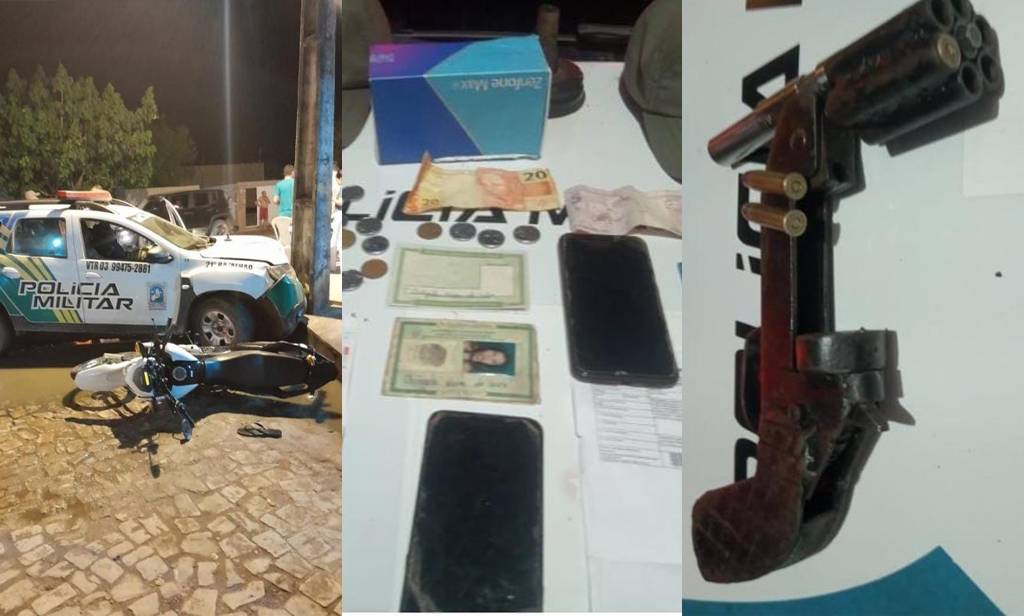 A motocicleta, uma bolsa feminina, aparelhos celulares e uma quantia em dinheiro foram recuperadosUm homem suspeito de ter roubado uma motocicleta e praticado diversos assaltos foi preso na noite dessa quarta-feira (16/08), após se envolver em um acidente durante uma perseguição policial em Altos (PI).