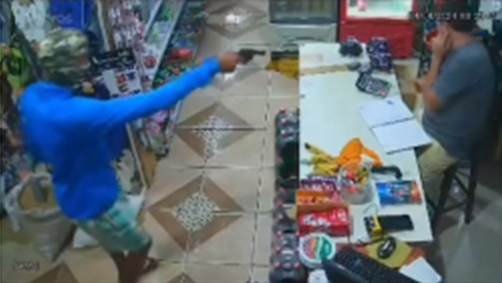 No vídeo gravado pelas câmeras de segurança, é possível ver o momento em que dois indivíduos, que não tiveram os nomes revelados, entram no estabelecimento portando uma arma de fogo.