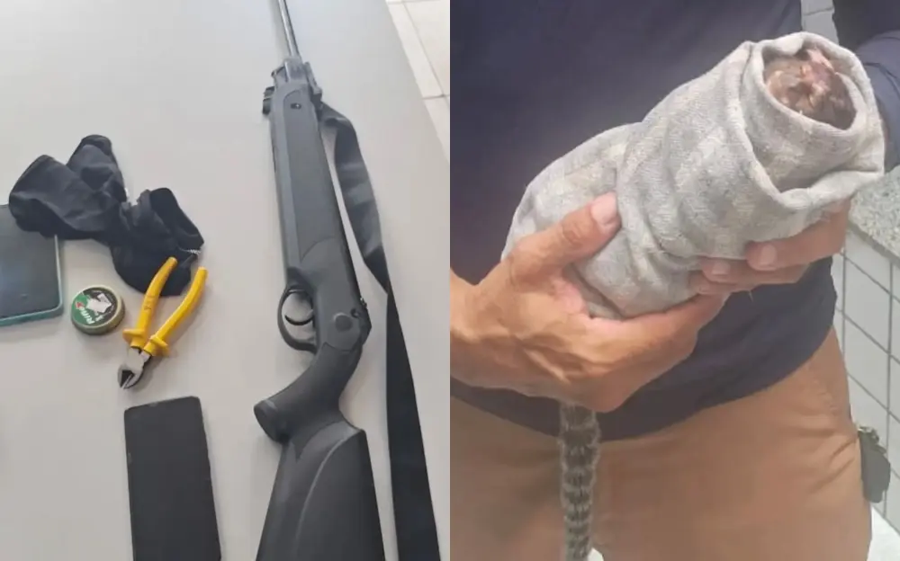 Durante a abordagem, os policiais apreenderam uma espingarda de pressão calibre 5.5 e munições do tipo chumbinho, utilizadas na prática ilegal. O suspeito foi conduzido à Central de Flagrantes, onde foi autuado.