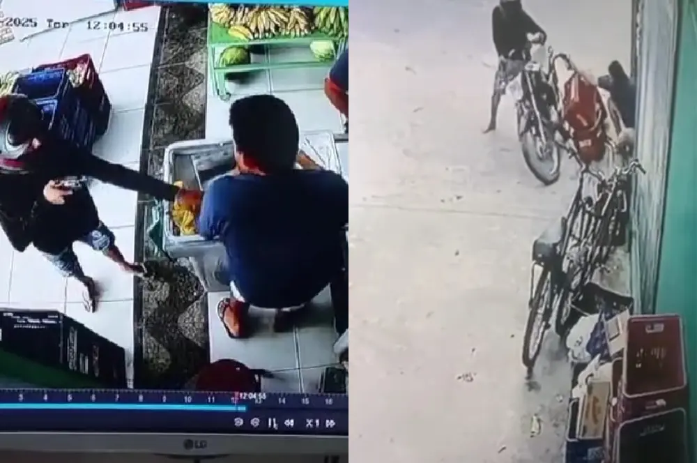 Nas imagens é possível ver a dupla chegando no local em uma motocicleta e entrando no comércio e já anunciando o assalto. Os criminosos chegam a retirar acessórios da vítima. Logo em seguida, o comerciante saca uma arma de fogo e dispara contra os suspeitos.