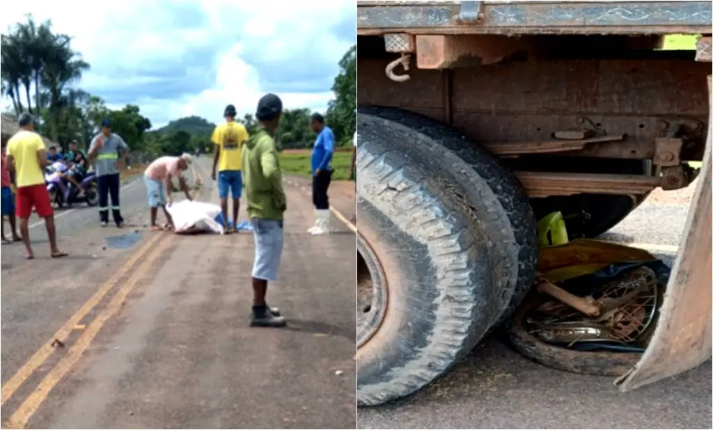 Com o impacto da colisão, a motocicleta foi parar embaixo do caminhão e o homem morreu na hora