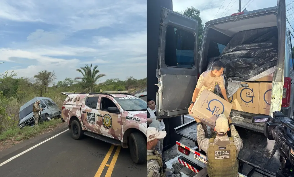 Duas pessoas que estavam no veículo foram conduzidas à sede da Polícia Federal em TeresinaUma carga de mais de 300 kg de cigarros contrabandeados foi apreendida na tarde desta sexta-feira (10/01) após o tombamento de uma van em um trecho da PI-221, próximo à cidade de Altos, no Piauí. O veículo, registrado no estado de Pernambuco, transportava os produtos ilícitos no sentido Alto Longá para Altos quando perdeu o controle e tombou às margens da rodovia estadual.