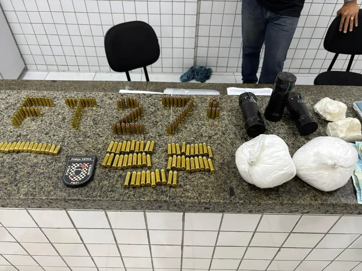 Na ação, foram apreendidos cerca de 1,136 kg de cocaína — avaliados em mais de R$ 50 mil —, além de 150 munições de diferentes calibres, R$ 479 em dinheiro e uma balança de precisão.