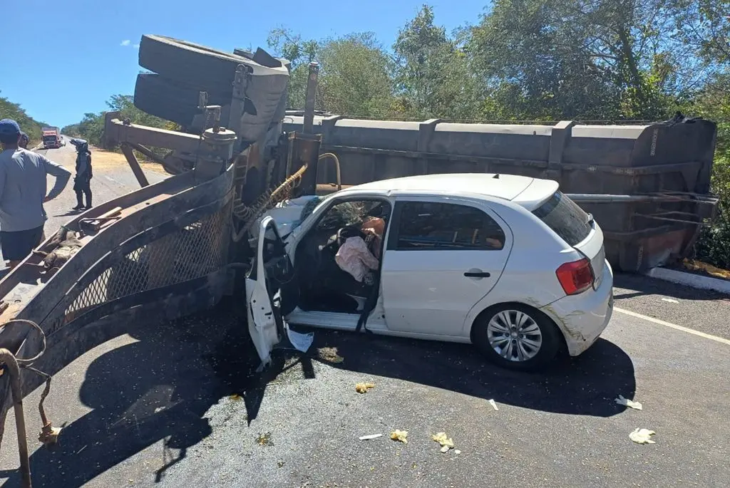 Carreta carregada com milho tomba e atinge carro no Piauí; condutor fica ferido
