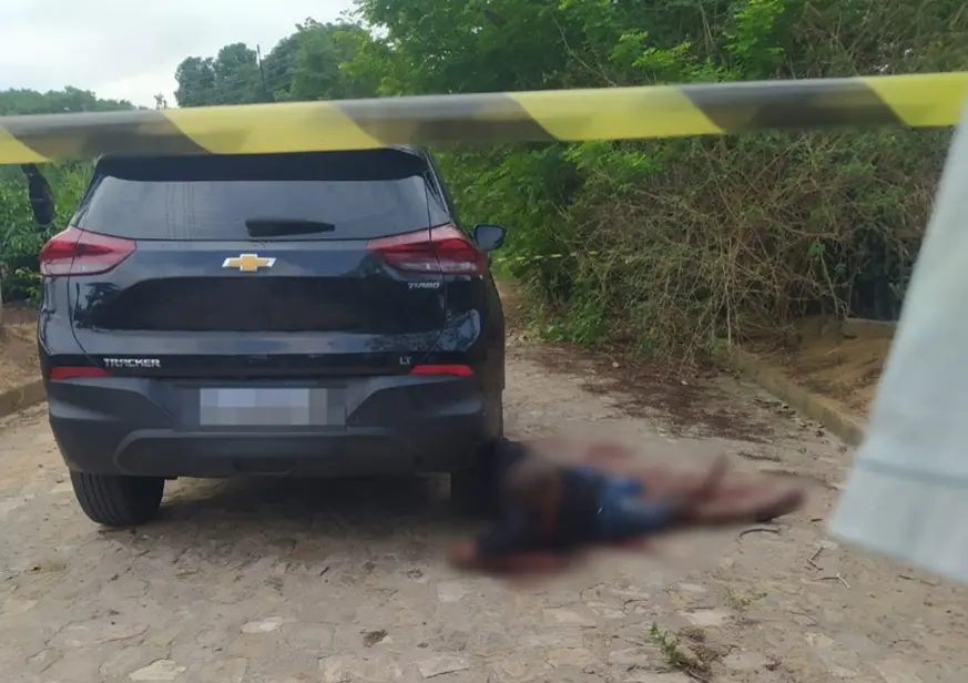 Em uma imagem é possível observar o corpo da vítima escorado em um automóvel de cor preta e modelo Chevrolet Tracker, apoiado sobre um dos braços. Grandes manchas de sangues também são visíveis por todo o corpo da vítima e também no chão.