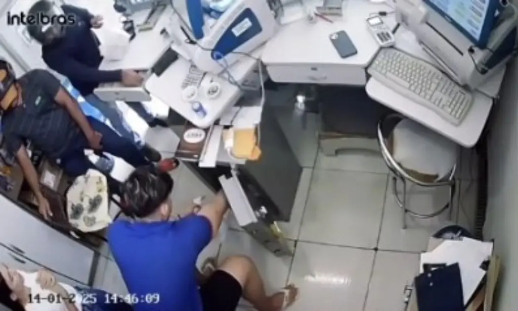 As imagens capturadas mostram um dos assaltantes parcialmente identificado. Ele usava um boné amarelo e levantou parcialmente o capacete durante a ação. O segundo suspeito vestia uma camisa de mangas longas e manteve o capacete o tempo todo, dificultando a identificação.