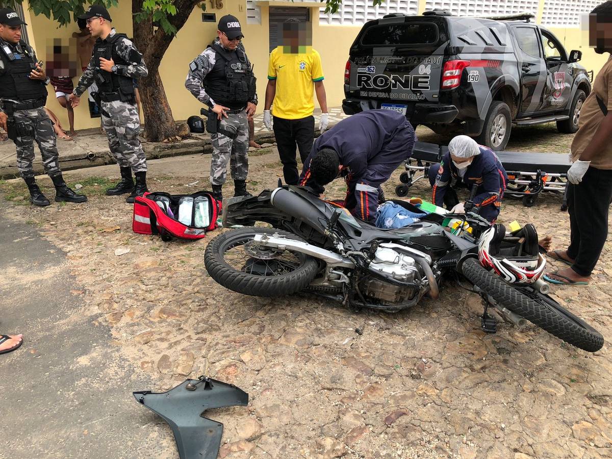 A dupla colidiu na lateral da viatura da RONE e com a batida um policial fraturou o narizUm criminoso ficou gravemente ferido após se envolver em um acidente por volta de meio dia deste sábado no bairro São Pedro, zona Sul de Teresina. Na ocasião, o policial também teve o nariz fraturado.