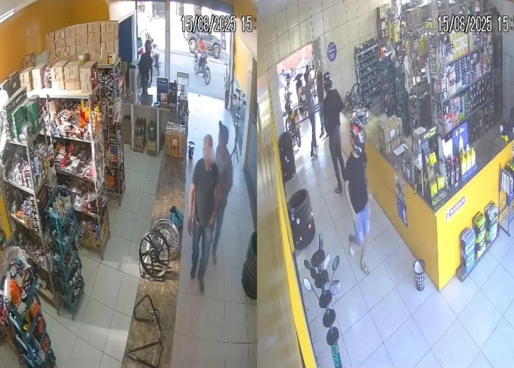 Imagens de câmeras de segurança mostram que dois suspeitos entraram no estabelecimento usando capacetes, enquanto outro, de boné, obrigou um funcionário a seguir até o fundo da loja sob a mira de uma arma. Do lado de fora, um quarto integrante aguardava em uma motocicleta, auxiliando na fuga do grupo.
