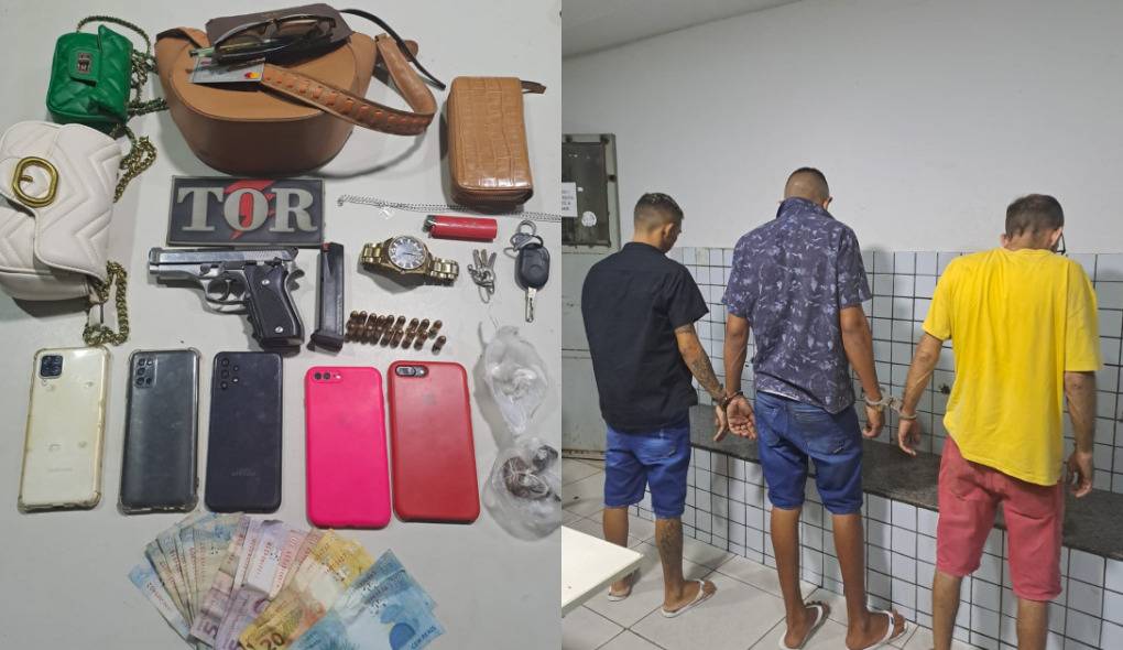 Com eles foram encontradas drogas, sendo cocaína, maconha e crack, uma pistola 380 com 18 munições, dinheiro e celulares.