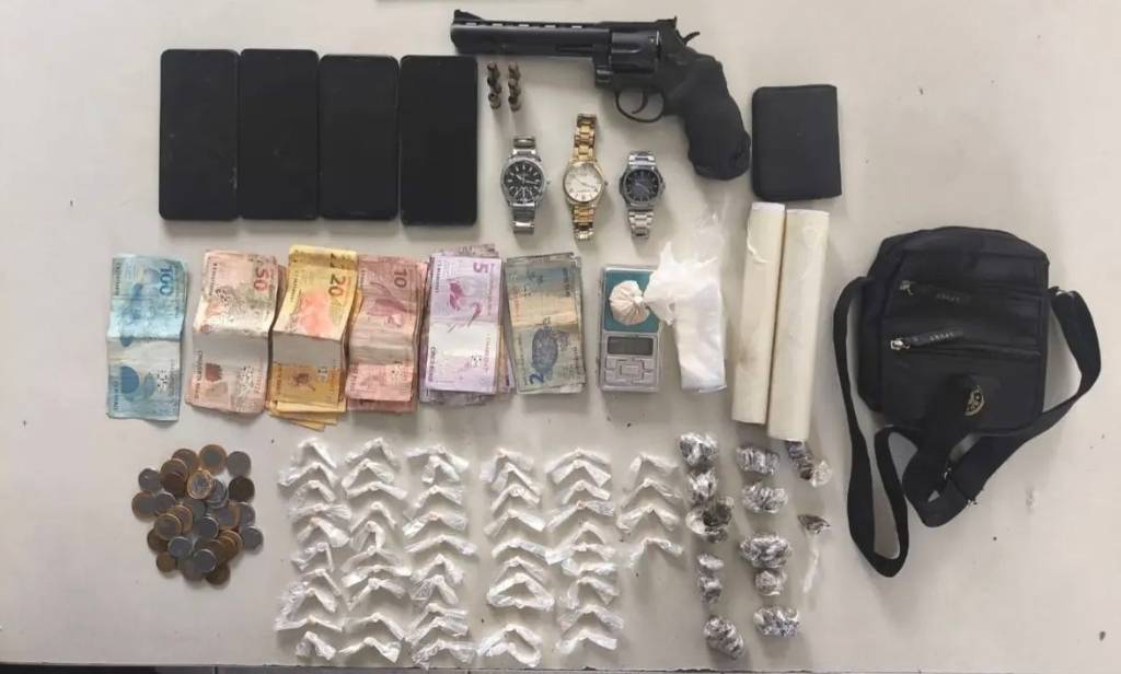 Durante a operação, foram apreendidos um revólver com munições intactas, 55 pedras de crack, 12 porções de maconha, celulares, relógios, balança de precisão, papel filme e R$ 1.200,00 em espécie.