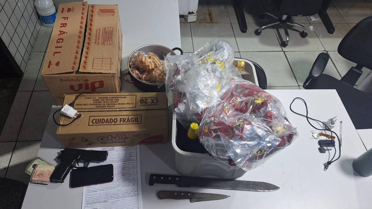 Com a aproximação da viatura, parte dos suspeitos tentou fugir. A mulher, identificada como F.D.I., foi alcançada pelos policiais e estava em posse do celular da vítima. O segundo envolvido, V.R.C., foi contido logo em seguida. No interior do veículo foram encontrados diversos objetos de procedência duvidosa, entre eles um simulacro de arma de fogo, um facão, uma faca, um celular Motorola, gêneros alimentícios variados e outros itens menores.