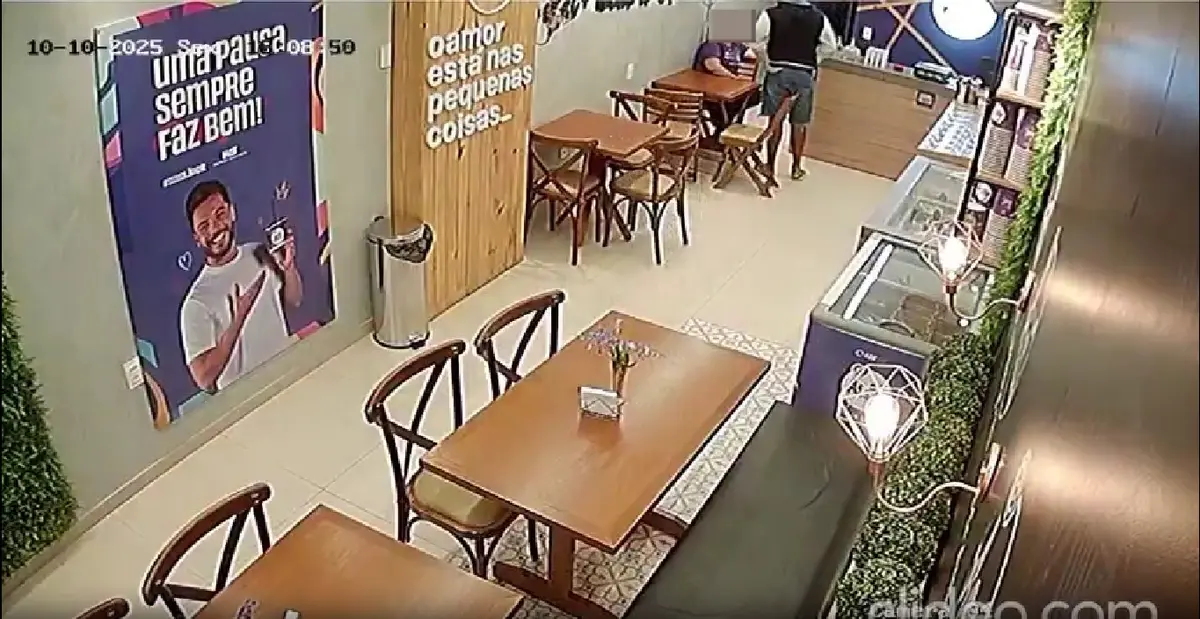 Imagens de uma câmera de segurança flagraram o momento em que o criminoso aborda a atendenteUma loja de açaí foi alvo de um assalto no início da noite desta sexta-feira (10/10), na Avenida Joaquim Nelson, zona Sudeste de Teresina. O crime ocorreu por volta das 18h08 e foi registrado por câmeras de segurança do estabelecimento.