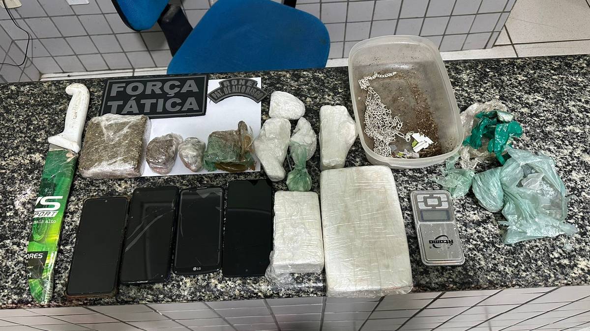O suspeito tentou fugir durante a abordagem pulando o muro e carregando duas sacolas contendo 1.900 gramas de cocaína e 350 gramas de maconha, cinco mudas de maconha, uma balança de precisão, quatro celulares e uma faca.