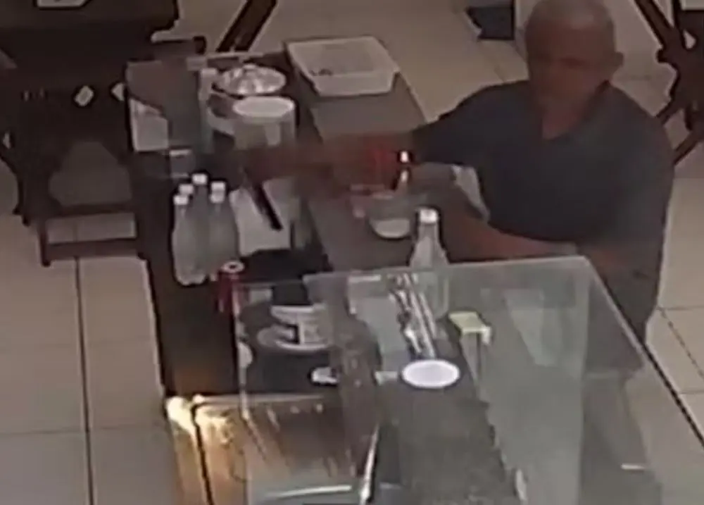 Nas imagens, Gizeudo aparece pedindo um copo de água à balconista. Enquanto a funcionária se vira para atender o pedido, o homem pega o celular que estava sobre o balcão, coloca no bolso e sai calmamente do local usando uma muleta.