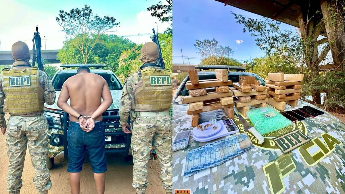 De acordo com a polícia, a equipe do BEPI recebeu informações sobre um possível carregamento de drogas na região e, durante a abordagem, encontrou 38 tabletes de maconha, dois pinos com substância análoga à cocaína, além de equipamentos como duas balanças de precisão e pacotes de pinos usados para armazenar drogas. Também foram apreendidos uma moto Bros preta, cinco celulares, uma faca, munições calibre .380, e itens de valor, como um cordão e uma pulseira dourada.