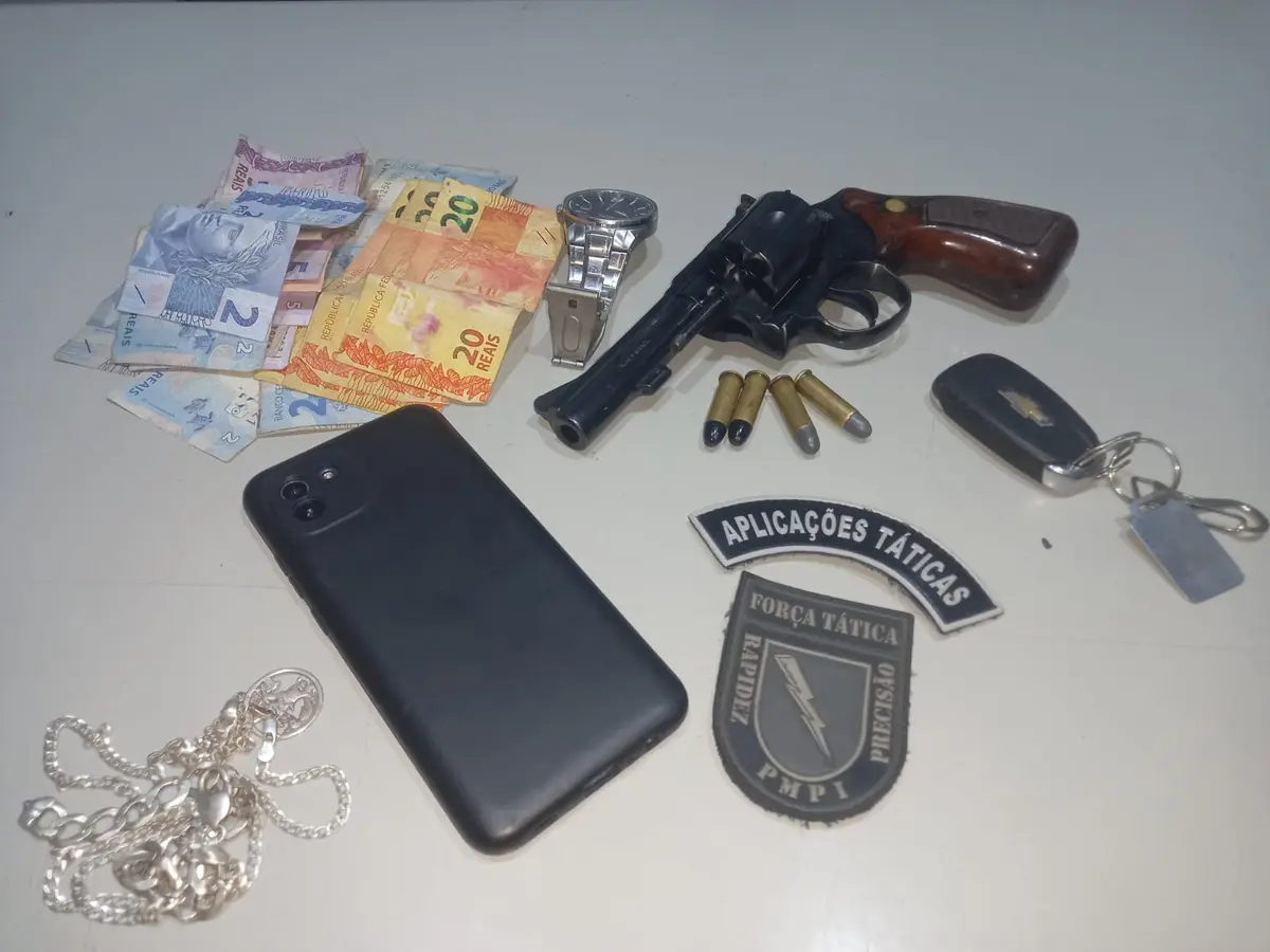 Foi feito o acompanhamento tático e, após ser parado, foi iniciada uma busca pessoal no condutor e no veículo, no qual foi encontrado um revólver calibre 38.