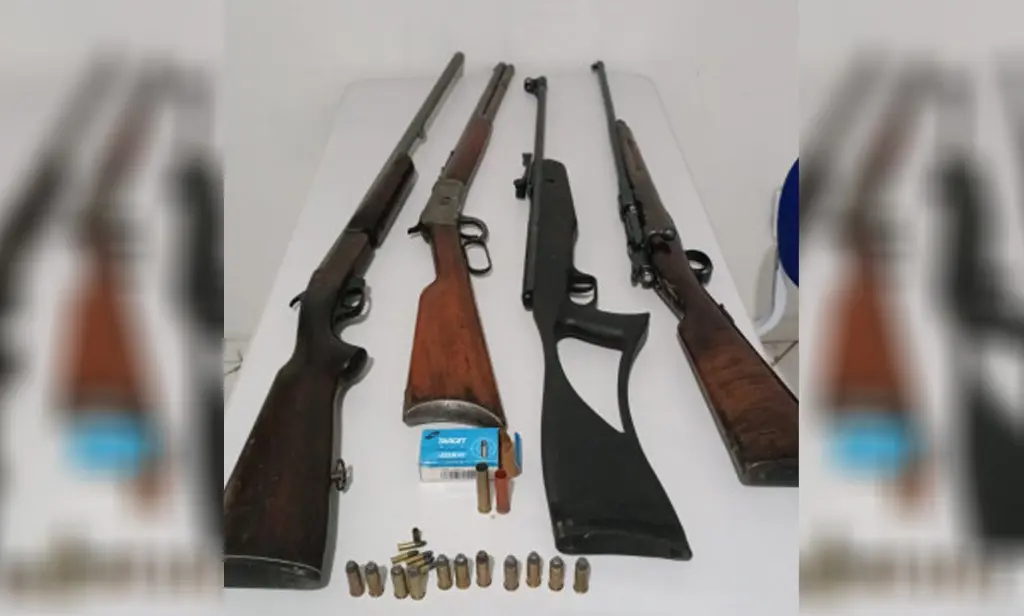 Foram apreendidos um rifle calibre .44, uma carabina de pressão, duas espingardas (sendo uma calibre .36 e outra calibre .20), onze munições calibre .44, cinco munições calibre .22 e três cartuchos calibre .36.
