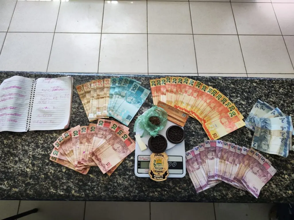 Durante a operação, os policiais encontraram maconha, uma balança de precisão, um triturador de entorpecentes, um caderno com anotações, além de R$ 1.231,00 em dinheiro e um celular que havia sido furtado na mesma madrugada na cidade. Suspeita-se que o suspeito do furto tenha trocado o aparelho por drogas.