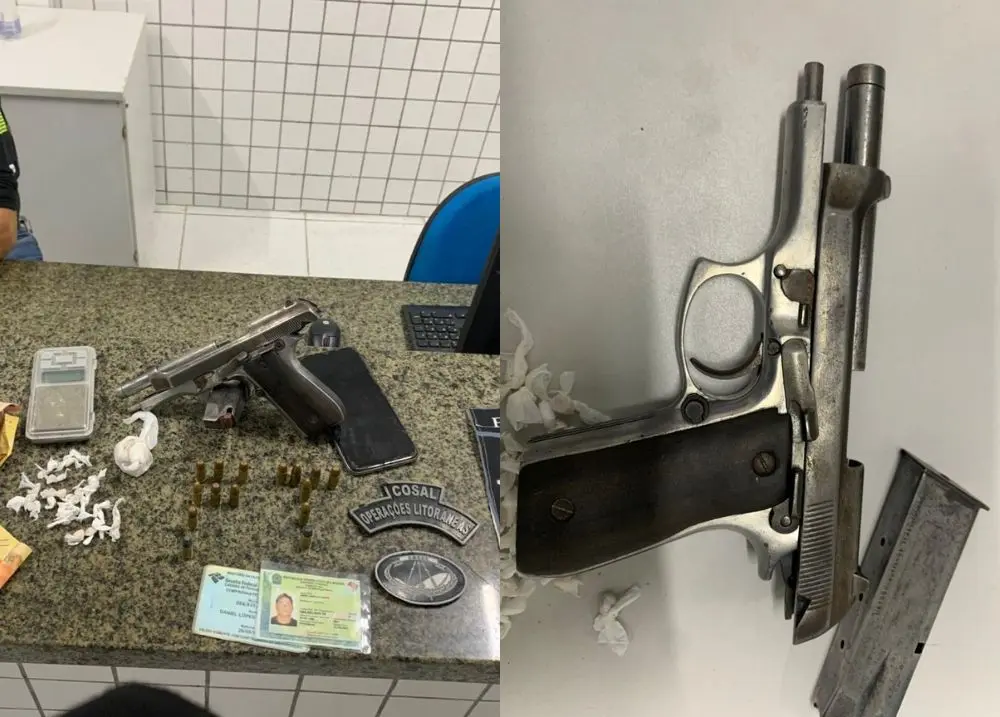 A ação teve início após denúncias de moradores sobre disparos de arma de fogo na região. Os policiais foram até o local indicado e encontraram o suspeito, identificado pelas iniciais D.L.S., nas proximidades de sua residência. Ao notar a chegada da viatura, ele tentou fugir correndo e chegou a jogar uma pistola 9mm no chão durante a tentativa de escape, mas acabou sendo capturado.
