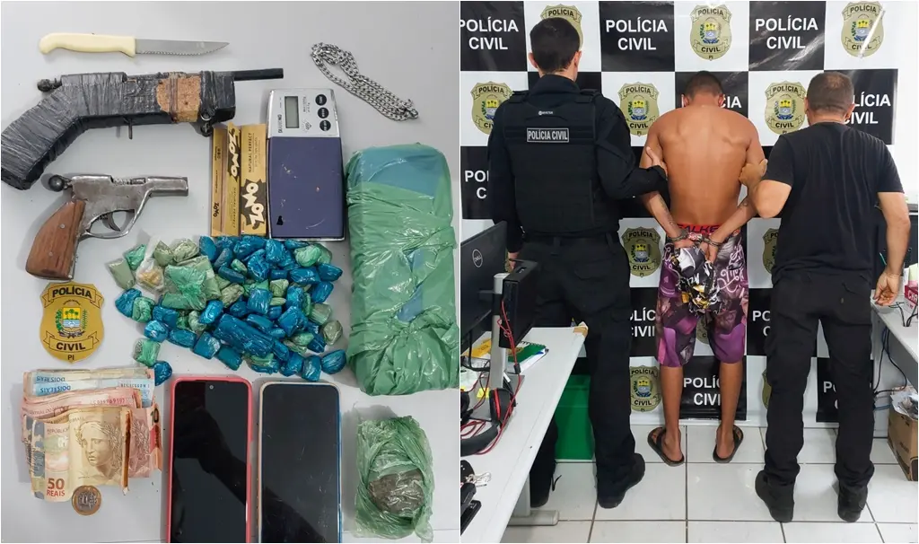 Com o homem foram encontradas armas de fabricação caseira, munições, drogas e celularesA Polícia Civil do Piauí (PC-PI) prendeu um homem identificado pelas inciais M.B.O., nesta quinta-feira (21/09), pelo crime de tráfico de drogas e posse ilegal de arma de fogo. A prisão aconteceu no bairro Cohab, no município de Bom Jesus, Sul do estado.