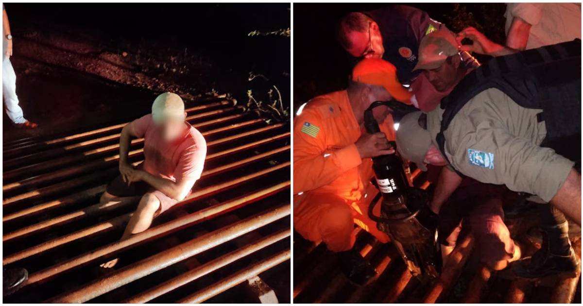 Adeilson foi socorrido pelo Grupamento da Policia Militar (GPM), após homem cair e ficar preso em um gradeado de tubos de ferro.