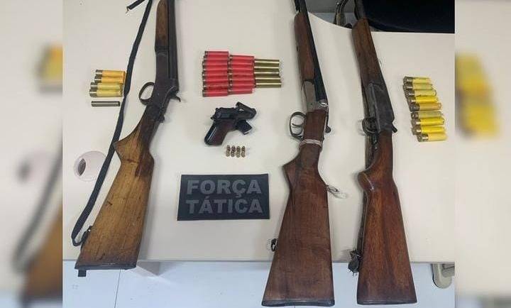 Na abordagem, a equipe encontrou três espingardas calibre 20, uma pistola, munições, além de animais abatidos, sendo um veado, dois tatus e duas cotias.