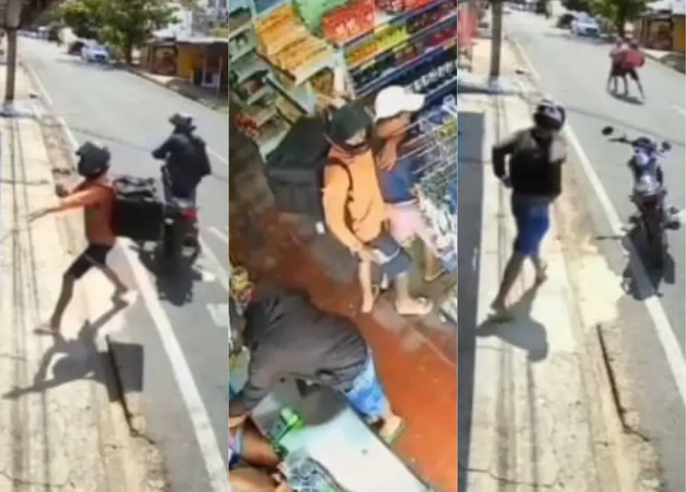 Uma das vítimas chegou a ser levada para o corredor do comercio e foi enforcada pelo criminosoImagens de câmeras de segurança revelam a ação violenta de dois assaltantes, nessa quinta-feira (25/09), em um mercadinho localizado no bairro Cristo Rei, zona Sul de Teresina. Os registros mostram clientes e funcionários sendo rendidos sob ameaça, minutos antes de a dupla tentar abordar um policial militar que passava pela rua.