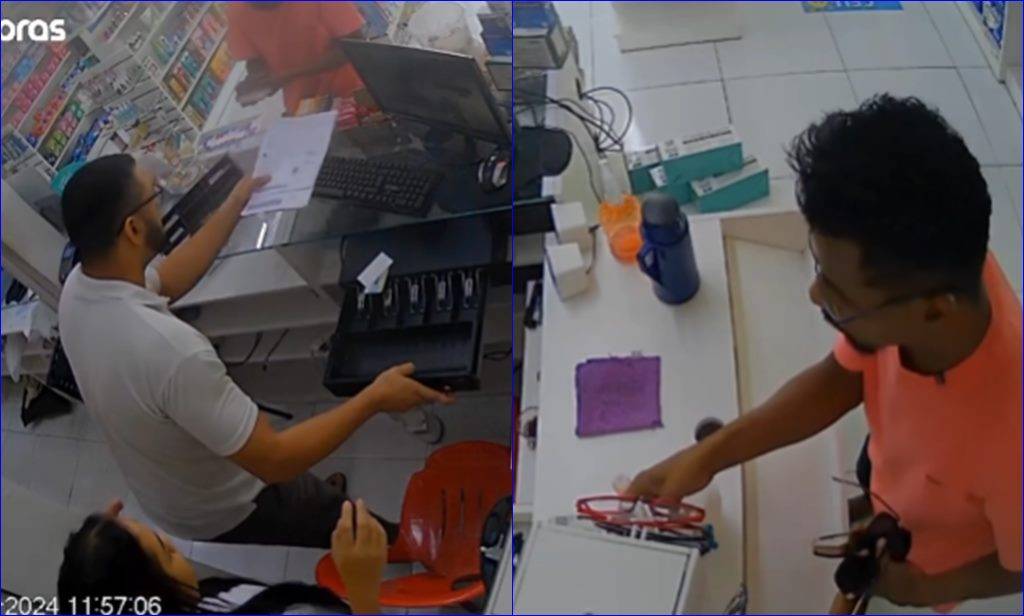 As câmeras de segurança do local registraram o momento da ação. O suspeito levou dinheiro, óculos e
