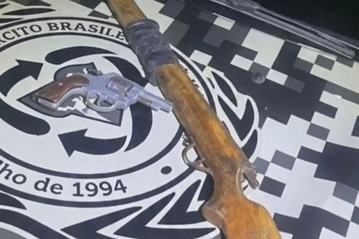 Durante a abordagem e a busca domiciliar, os policiais apreenderam um revólver calibre .32 e uma espingarda de fabricação artesanal. Após a ação, o suspeito recebeu voz de prisão e foi conduzido à Delegacia de Polícia, onde foram adotados os procedimentos legais cabíveis.