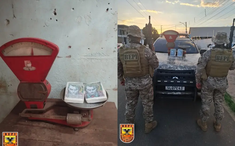 Durante as diligências, ao se aproximar do endereço indicado, os policiais visualizaram um indivíduo que, ao perceber a presença da viatura, empreendeu fuga, adentrando uma residência em estado de abandono. A equipe desembarcou e realizou varredura no imóvel e em seu perímetro, onde localizou dois tabletes de substância análoga à pasta base de cocaína, além de uma balança de armazém, comumente utilizada para pesagem de entorpecentes.