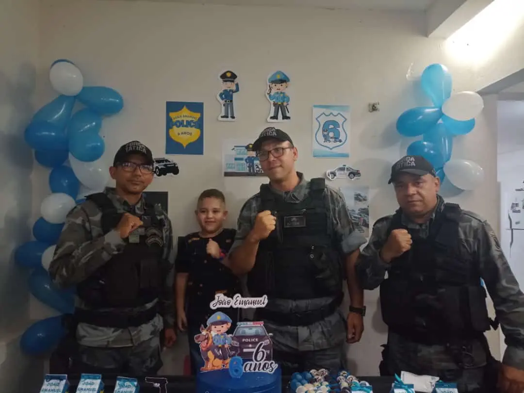 Elaine Moura, tia da criança, explicou que João Emanuel é fã de tudo que envolve o meio militar. Quando ela perguntou para ele o que queria de presente, ele disse que queria o aniversário de polícia. Com isso, a família organizou o tema da festa, mas faltava o principal: os policiais.