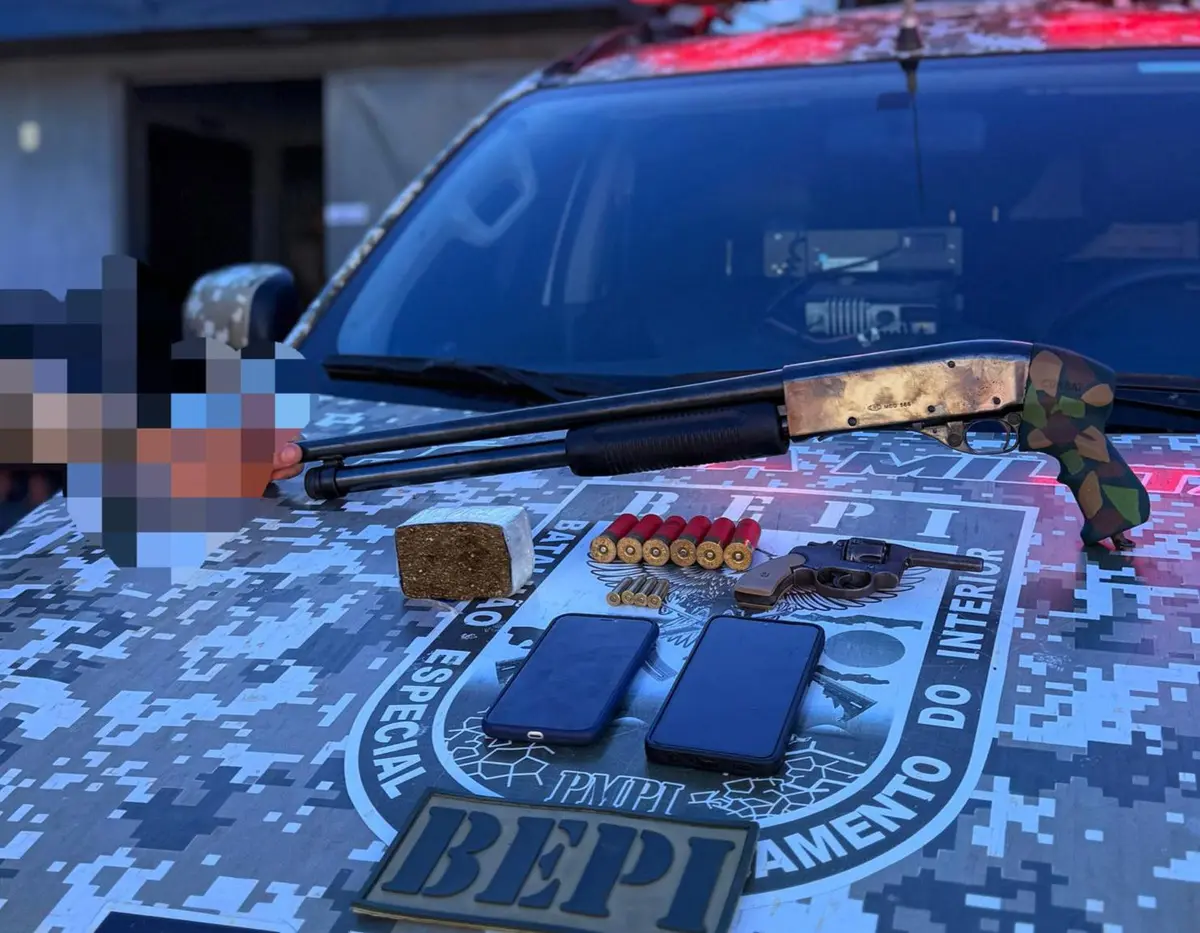 Com os conduzidos, identificados pelas iniciais A.G.S., L.F.M.S. e E.T.A.R, foram apreendidos um revólver calibre .32, munições de calibre .38, uma espingarda calibre 12 com seis munições, uma porção de substância análoga à maconha e dois aparelhos celulares.