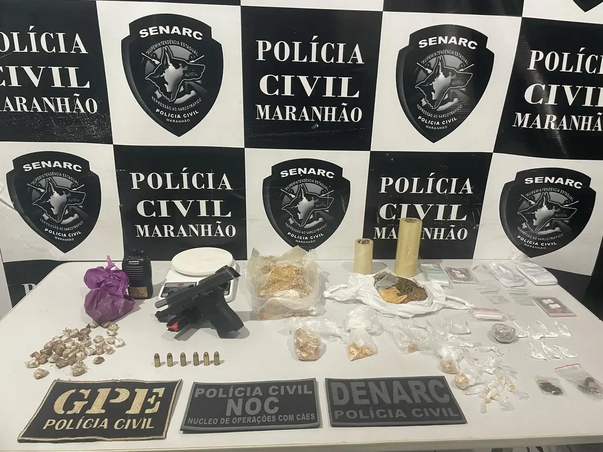Uma mulher foi conduzida à delegacia para prestar esclarecimentosDurante uma operação realizada nesta sexta-feira (11/04), no bairro Vila do Bec, em Timon, a Polícia Civil do Maranhão apreendeu uma grande quantidade de drogas e uma arma de fogo que teria sido subtraída de um policial penal do Piauí. A ação foi conduzida por equipes da Delegacia de Repressão ao Narcotráfico (Denarc) do município.