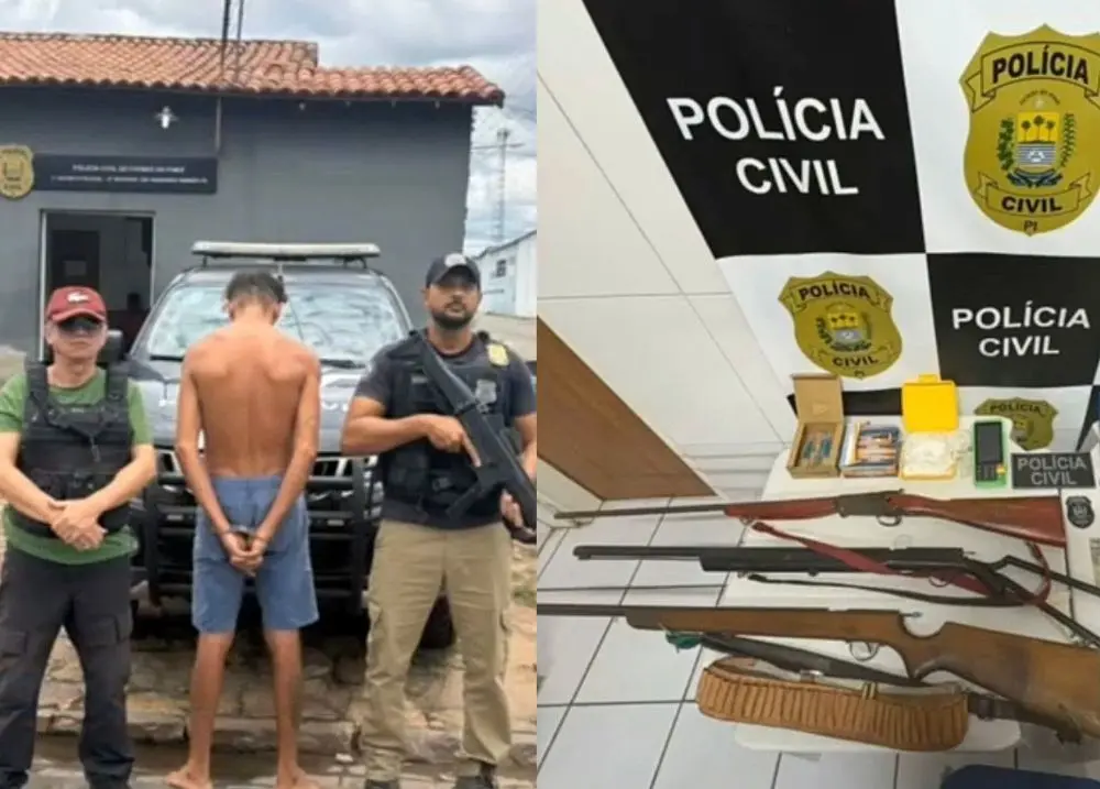 Ação na zona rural resultou na apreensão de espingardas, dinheiro e material para drogasA Polícia Civil do Piauí prendeu um homem suspeito de envolvimento com o tráfico de drogas durante uma ação realizada na zona rural do município de Anísio de Abreu, no Sul do estado. A operação foi conduzida por equipes da Delegacia Seccional de São Raimundo Nonato e teve como foco a apuração de crimes registrados em 2021, incluindo tráfico de entorpecentes, porte ilegal de arma de fogo e disparo de arma contra uma guarnição da Polícia Militar.