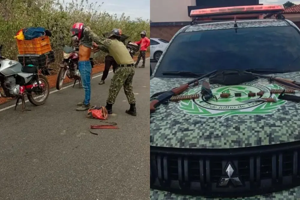 Material apreendido inclui armas, cartuchos e cães usados na prática do crimeNa manhã desta quinta-feira (09/01), a Polícia Militar do Piauí, por meio da 1ª Companhia de Policiamento Ambiental (CIPA), realizou uma ação no povoado Espírito Santo, em Caracol, que resultou na prisão de três homens suspeitos de praticarem caça ilegal. A operação teve início quando a equipe avistou quatro indivíduos em motocicletas equipadas com "basquetes" na garupa, dispositivos comumente usados para transportar equipamentos de caça.