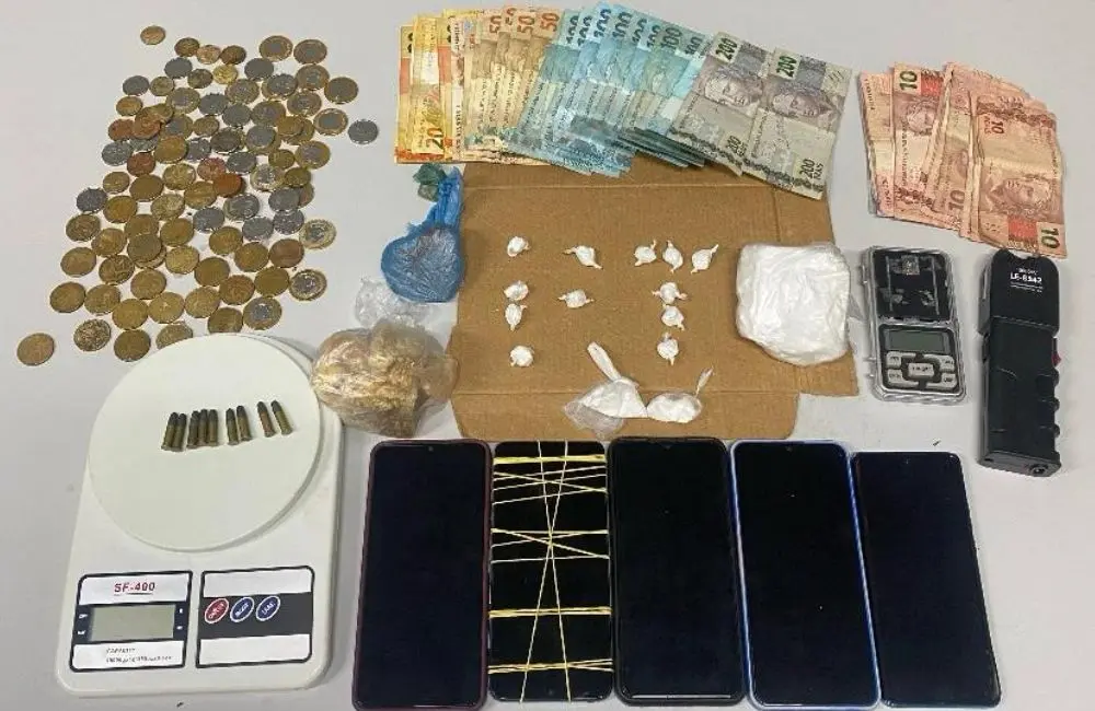 Após diversas denúncias sobre a comercialização de entorpecentes em uma residência no bairro Novo Horizonte, as equipes do 23º BPM passaram a monitorar o local nos últimos dias. Durante a ação, os policiais flagraram a prática do crime no imóvel, onde foram encontradas substâncias análogas à cocaína, crack e maconha, além de balanças de precisão, dinheiro em espécie, diversos celulares, munições cal. 22 e uma máquina de choque.