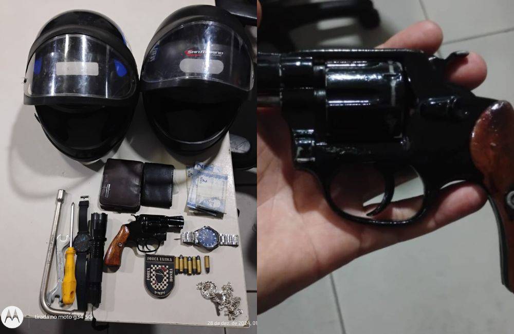Durante a abordagem, os policiais realizaram uma busca pessoal nos dois homens, identificados pelas iniciais P. H. L. e E. R. O. e encontraram com um deles um revólver, além de sete munições. Também foram apreendidos diversos objetos, incluindo dois relógios de pulso, colares e pulseiras de prata, capacetes, uma lanterna e documentos pessoais dos suspeitos.
